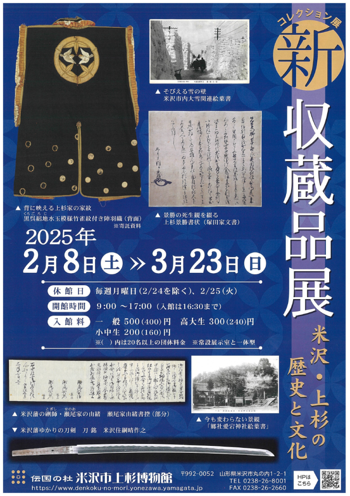 米沢市上杉博物館にて、「新収蔵品展」が開催されます。当博物館には、過去10年で収集した1万点以上の資料がありますが、その内、本展では、平成30年以降に寄贈・寄託された歴史資料を中心に、米沢・上杉の歴史と文化にまつわる多彩な資料を展示します。展示資料は全て初公開です。この機会に、米沢・上杉の新たな歴史の一面をお楽しみください。<開催期間>令和7年2月8日(土)〜3月23日(日)<場所>伝国の杜米沢市上杉博物館<料金>一般:500円高大生:300円小中生:200円<問合せ>米沢市上杉博物館 0238−26−8001詳細は、チラシをご覧ください。