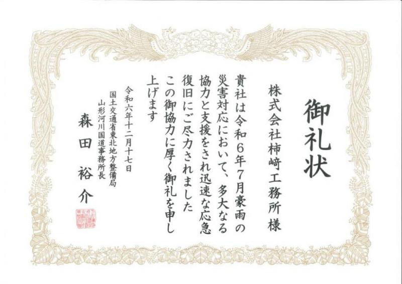 令和6年12月17日に山形河川国道事務所長より、7月豪雨の災害対応において感謝状をいただきました。
