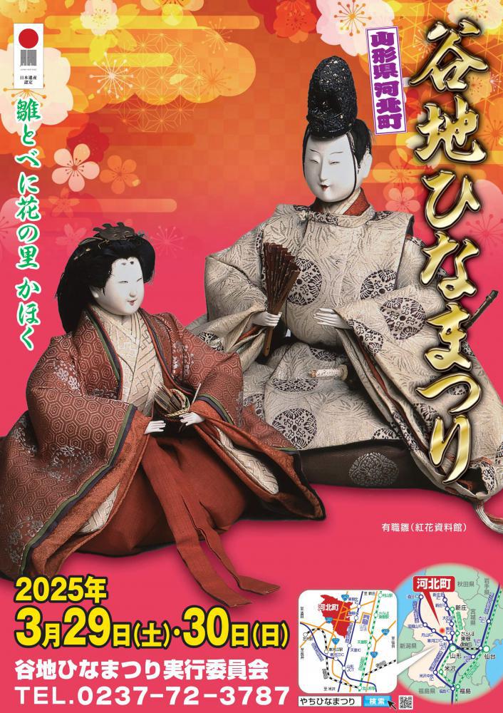 「谷地ひなまつり2025」は3月29日(土)・30日(日)の2日間開催いたします。河北町谷地のひなまつりは月遅れの4月に地区をあげて行われ、北口通りに「ひな市」が立ちます。ここ谷地は、みちのくひなまつり発祥の地といわれています。紅花交易による当時の繁栄ぶりを物語るのが、いまも町内の旧家にのこる雛人形の数々。享保雛、次郎左衛門雛、古今雛、御所p人形などそれぞれの家で代々受け継がれてきた格調高い時代雛が、ひな市通りを中心に一般公開されます。また、期間中は秋葉神社では「ひな供養」の神事が行われます。ご自宅で処分できずにある人形がありましたら供養いたします。(初穂料:4000円〜)役場ロビーでは、さいたま市岩槻人形組合による人形製作実演と木目込人形製作体験(要予約)を行います。体験のご予約は河北町観光物産協会までお願いいたします。紅花資料館では、美しい日本文化を感じることができる着物の着付け体験や時代雛展、ひなまつり茶会を行います。河北中央公園では、3月30日(日)にいもこ列車一般公開を行います。乗車できる蒸気機関車は珍しく、大人から子どもまでお楽しみいただけます。お誘い合わせの上、谷地ひなまつりに、ぜひご来場ください【公式サイト】河北町観光なび