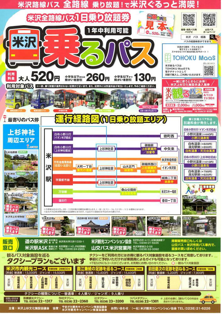 米沢市内 1日バス乗り放題で、米沢の観光を満喫!米沢市内の全路線バス(循環バス右回り・左回り・学園都市線・市民バス万世線)及び山交バスの特定区間、これらの路線が1日乗り放題で1日大人520円!米沢を観光するには便利な1日バス乗車券です!さらにTOHOKU MaaSでは電子チケットとしてスマホでご利用できます!ぜひご利用ください!◇利用期間 2025年4月1日(火)〜1年中利用可能 ◇販売価格 大人520円 (小学生以下または障がい者割引 260円 小学生以下かつ障がい者割引130円) ◇販売窓口 ・山交バス、米沢市民バス車内・山交バス米沢営業所・米沢駅観光案内所ASK・米沢観光コンベンション協会(上杉神社内)   ・道の駅米沢 総合観光案内所米沢乗るパス PDF    ※米沢上杉文化施設共通入館券「観るパス」も一緒にお買い求めいただき観光にご利用いただくと便利です。米沢観るパスPDF 【お問い合わせ】(一社)米沢観光コンベンション協会         TEL:0238-21-6226