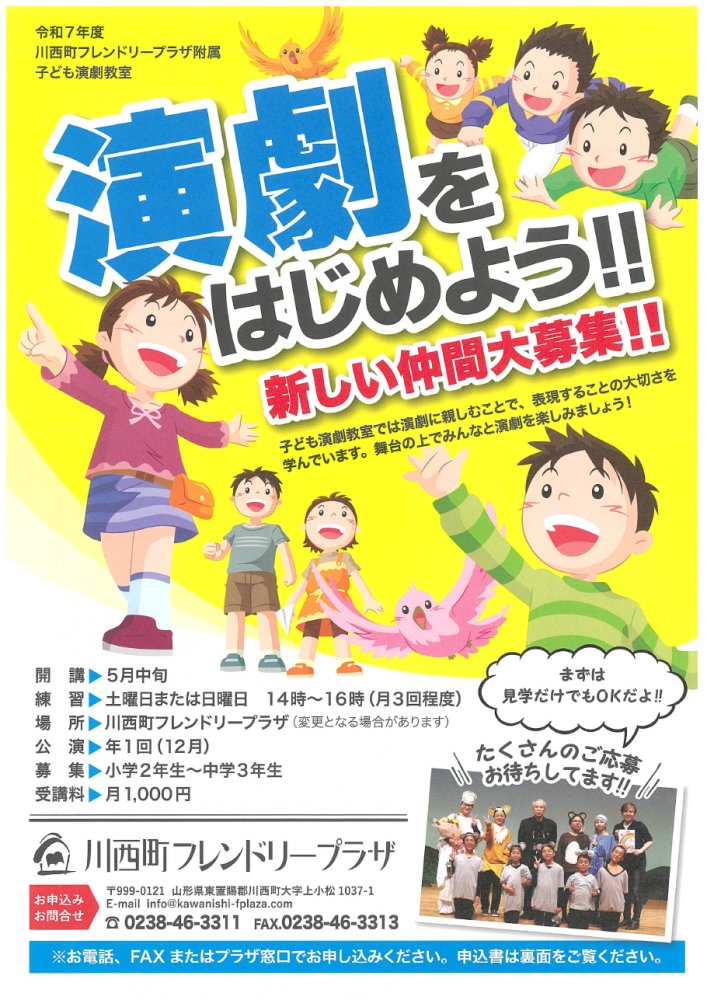川西町フレンドリープラザでは、子ども演劇教室を開催しており、現在、団員を募集しています。子ども演劇教室では、演劇に親しむことで、表現することの大切さを学んでいます。舞台上でみんなと演劇を楽しみましょう!<募集対象>小学2年生〜中学3年生<開講>令和7年5月中旬<練習日時>土曜日または日曜日 14時〜16時(月3回程度)<場所>川西町フレンドリープラザ<公演>年1回(12月)<受講料>月1,000円<お問い合わせ>川西町フレンドリープラザ 0238−46−3311詳細は、チラシをご覧ください。