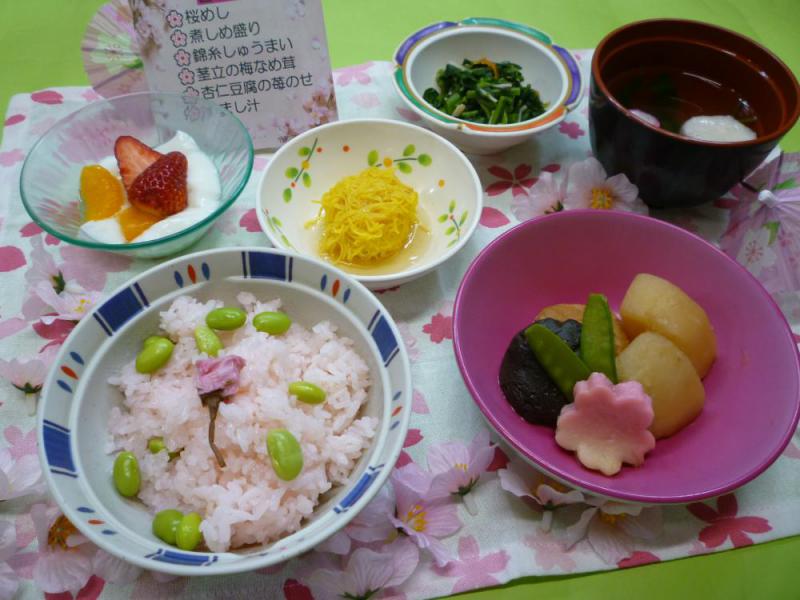 栄養課です。白鷹町内の桜も満開になり、春の訪れを感じています。そこで、食事でも春を感じていただこうと、「春の御膳」を提供しました。特に桜めしが好評で「うつくしいごと〜」と声が聞かれ、みなさん楽しんで召し上がっていました。