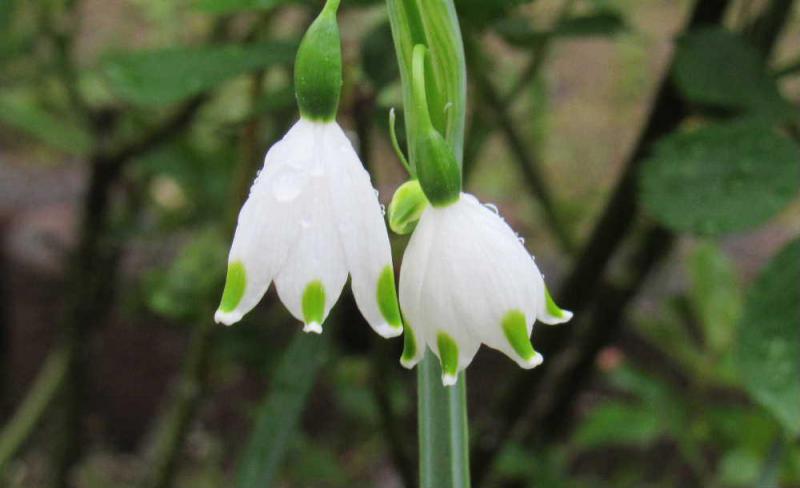 ●白く可愛いスズランスイセン 知人からいただいた「スズランスイセン」が庭を彩っています スズランのような形の白い花ですが雨に打たれ寒そうに咲いています 1〜2センチほどの小さな花ですが花びらの縁には緑色の斑点が可愛らしくついています 花壇の縁を彩る可愛い花です