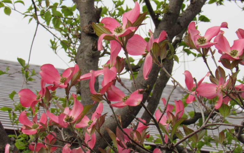 ●初夏を彩るハナミズキ わがやのハナミズキが今年は花が咲かないだろうと思っていましたがなんと小さな2輪の花をつけていました 街路樹として白やピンクの花が街を彩ってくれています 2輪だけですが隣家の庭では見事に花を咲かせています 初夏を彩る代表的な花の一つです