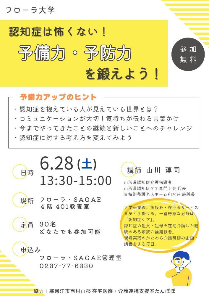 フローラ・SAGAE様、寒河江市西村山郡在宅医療・介護連携支援室たんぽぽ様より以下の講座講師の依頼をいただきましたので、お知らせいたします!令和7年6月28日(土)13:30〜15:00 フローラ・SAGAE 4階 401教養室「認知症は怖くない! 予備力・予防力を鍛えよう!」講師:山川淳司定員30名(地区などに限定なく、興味ある方どなたでも参加可能とのことです)申し込みは、フローラ・SAGAE管理室まで 0237(77)6330皆さまのお越しをお待ちしております〜山川