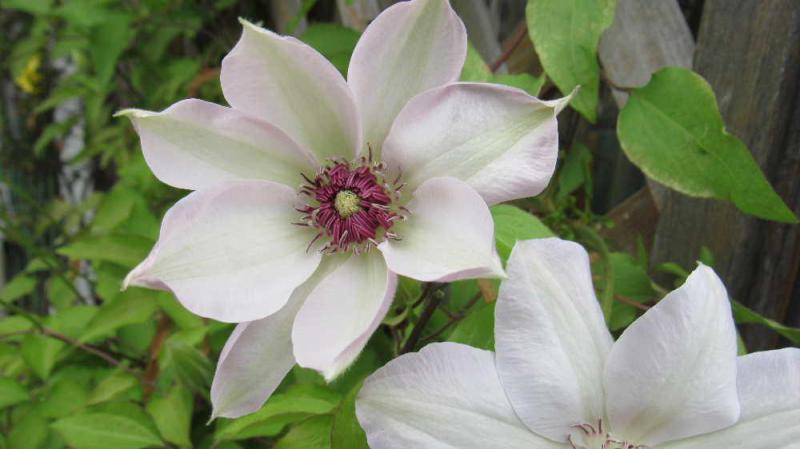 ●クレマチスが開花 とんがり帽子のように膨らんでいたクレマチスの花が咲きました 白と紫の2種類植えていますが紫色の花は白に圧倒されるかのようにあまり花をつけてくれません イギリスではつる性の女王ともいわれ テッセンとも呼ばれますがテッセンは中国に自生している花だそうです どんどんつるを伸ばし壁面を飾ってくれています