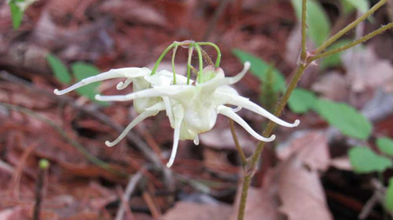 ●白い3つの花が付いた「キバナイカリソウ」 中川地区の新田堤のほとりに枯れた葉っぱの中に 真っ白な変わった形の花を植物に詳しい知人が見つけ「キバナイカリソウ」と教えていただきました 漢字で書くと「錨草」書き 花が和船の錨(いかり)に似ていることから付いた名前だそうです 低い山の雑木林の中に生えている落葉の多年草です