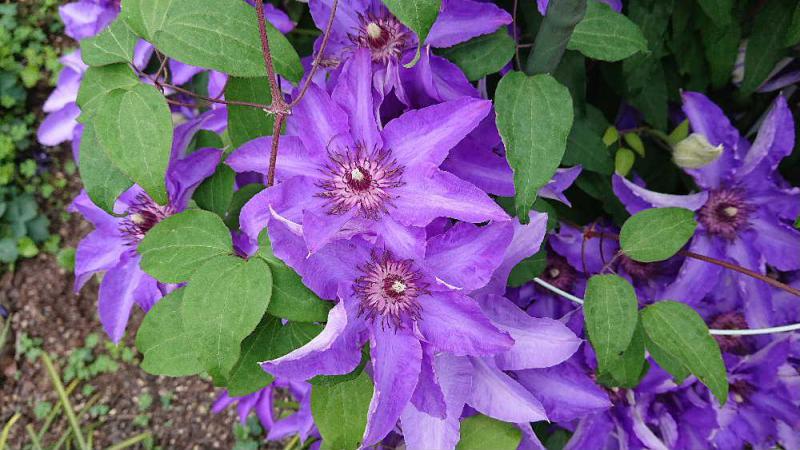 ●庭い白い「クレマチス」が今を盛りとさいていますが紫色も咲きそうです 梅雨の時期になると黄色や白に代わってアヤメなど紫色の花が多くなってきます 雨の季節にぴったりの紫色の「クレマチス」が代表するような花色で咲いています