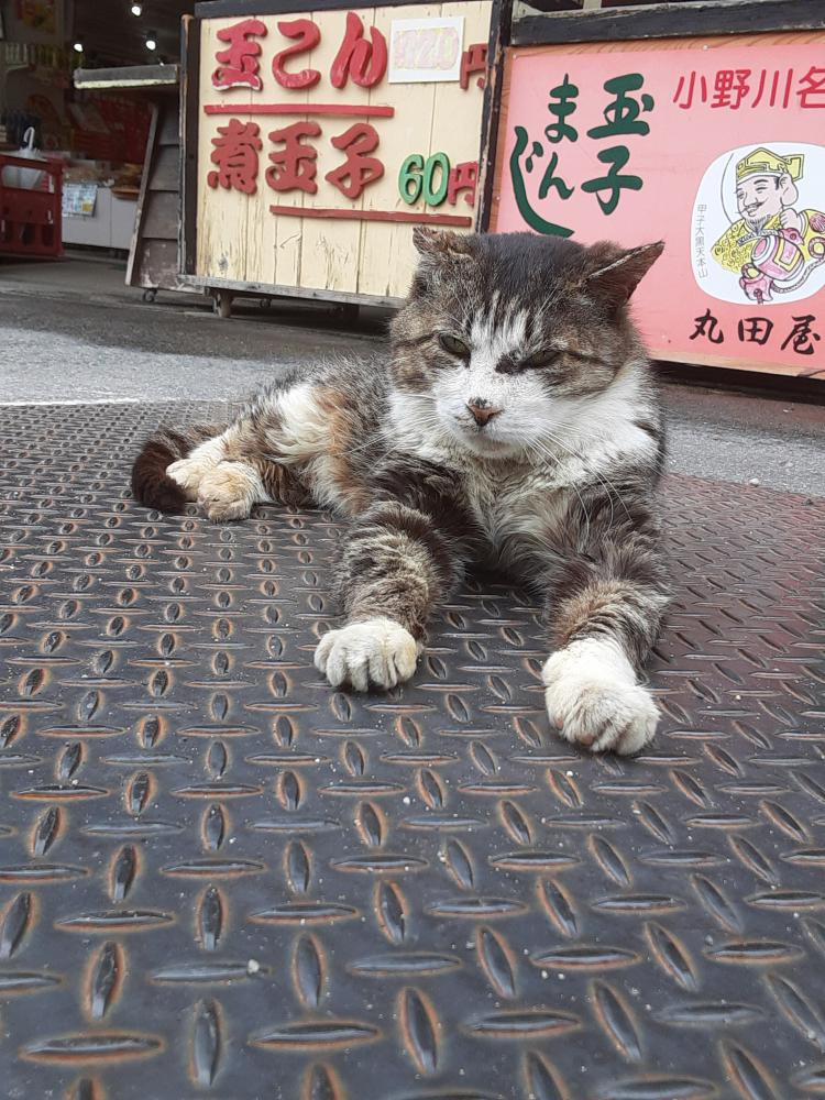 地域ねこの タンタン、店前の 鉄板の上で 暖まっています。