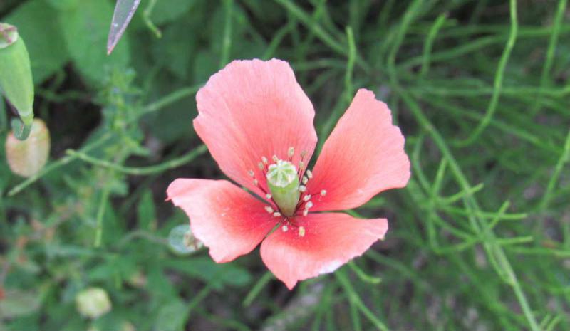 ●近所の道路端にオレンジ色の花が咲いていました 調べてみると「ナガミヒナゲシ」ではないかと思われます 4枚の花びらが付いており実は(芥子坊主 けしぼうず)細長く長実雛芥子(ながみひなげし)はここからついたといわれています 実の中には小さな芥子粒ほどの種がはいっているそうです この植物には害虫や動物から身を守るために有毒物質を含んでおり手でさわったりするとかぶれる恐れがあるそうです 気をつけたい植物であることを知りました
