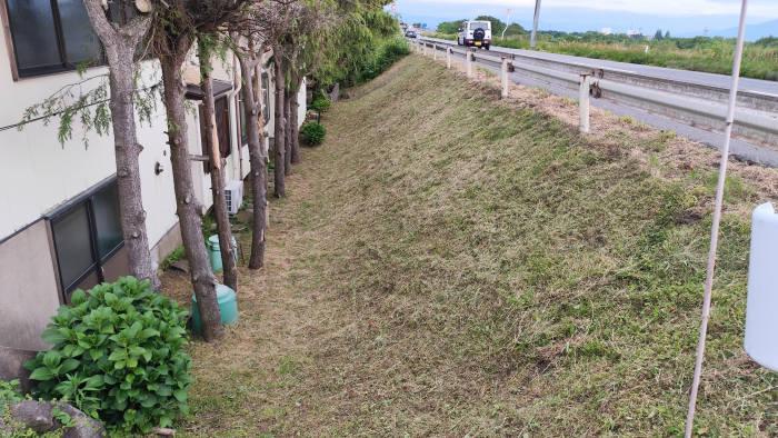 今年もやって来ました。草刈りシーズン!斜面はきれいに刈りました。斜面奥のほうが刈ってない状況です。相当伸び放題で悲惨です。上面は、行政が除草剤をまいたので、ずっと先まで枯れていました。