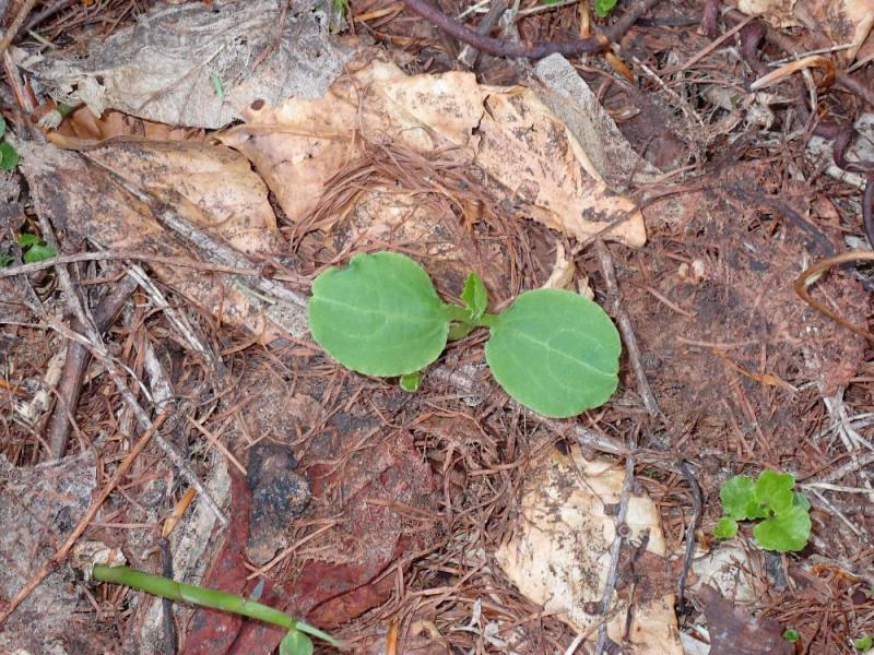 センタ−南の土手下に緑の塊そのもののような実生(双葉)が数個の芽出しを見る。