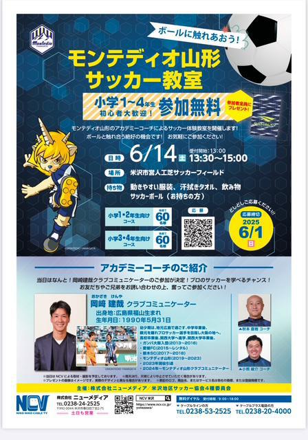 NCV、米沢地区サッカー協会主催でモンテディオ山形サッカー教室が行われます。日時 6月14日(土)13時30分〜15時場所 米沢市営人工芝サッカーフィールド持ち物 動きやすい服装、汗拭きタオル、飲み物、サッカーボール(お持ちの方)募集人数 小学1・2年生向けコース 60名 小学3・4年生向けコース 60名コーチ岡父Nラブコミュニケーター秋本コーチ小熊コーチ ぜひ、参加してみてください〜