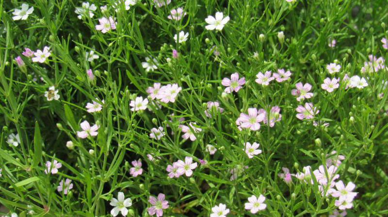 ●私の好きな白とピンクの「カスミソウ」が咲きはじめました 花屋さんに並んでいる「カスミソウ」は背丈の高い切り花として売られていますが我が家の「カスミソウ」は矮化性の背丈が10センチほどで小さな花です 満開になるとまさに霞のように見えます 毎年吊り下げ式のプランターに植栽しているのですが種がこぼれて至る所に咲いておおり初夏から秋まで一年中楽しませてくれる可愛い花です