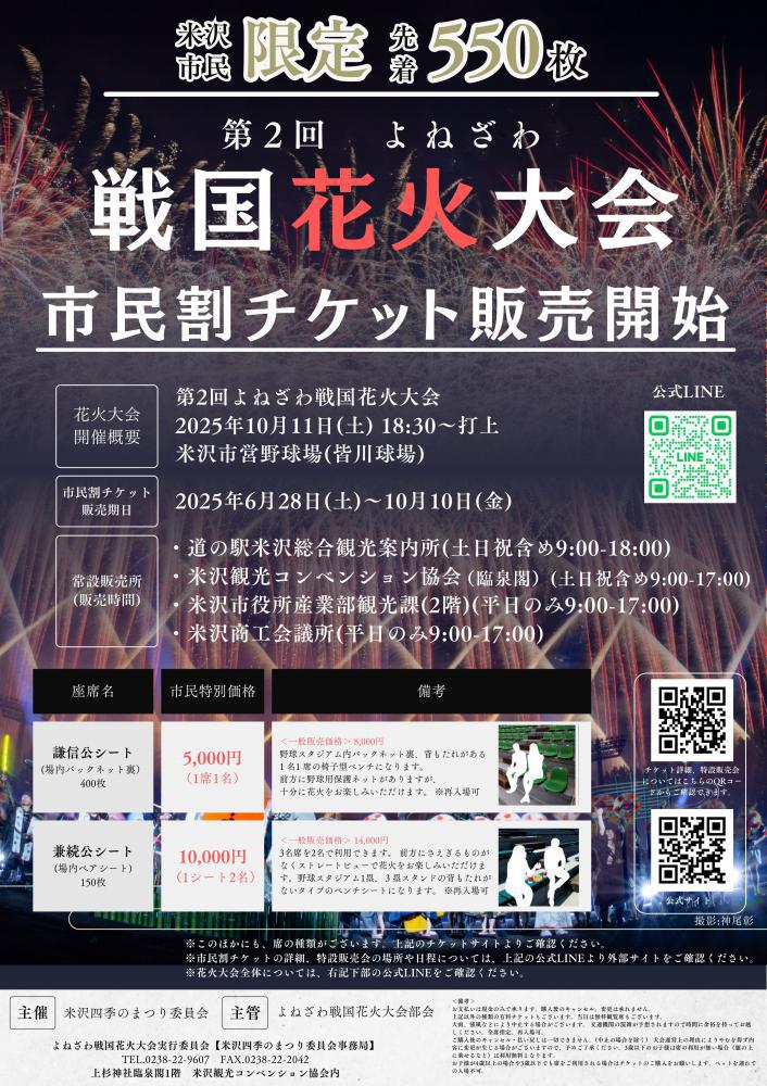 ◇第2回「よねざわ戦国花火大会」市民割チケット6/28(土)〜販売開始!◇昨年大好評だった「よねざわ戦国花火大会」が、今年も10月11日(土)に開催されます!開催にあたり、6月28日(土)〜お得な市民割チケットを販売します!米沢市民限定、先着550枚ですのでお早めにお買い求めください!!◇花火大会開催概要2025年10月11日(土)18:30〜打上場所:米沢市営野球場(皆川球場)◇市民割チケット販売期日2025年6月28日(土)〜10月10日(金)◇常設販売所(販売時間)・道の駅米沢 総合観光案内所(土日祝含め9:00〜18:00)・米沢観光コンベンション協会(臨泉閣)(土日祝含め9:00〜17:00)・米沢市役所産業部観光課(2階5番窓口)(平日のみ9:00〜17:00)・米沢商工会議所(平日のみ9:00〜17:00)●謙信公シート(場内バックネット裏)400枚/1席1名5,000円〈一般販売価格8,000円〉野球スタジアム内バックネット裏、背もたれがある1名1席の椅子型ベンチになります。前方に野球用保護ネットがありますが、十分に花火をお楽しみいただけます。※再入場可●兼続公シート(場内ペアシート)150枚/1シート2名10,000円〈一般販売価格14,000円〉3名席を2名で利用できます。前方にさえぎるものがなくストレートビューで花火をお楽しみいただけます。野球スタジアム1塁、3塁スタンドの背もたれがないタイプのベンチシートになります。※再入場可【お問い合わせ】よねざわ戦国花火大会実行委員会(米沢四季のまつり委員会事務局)TEL:0238-22-9607※第2回よねざわ戦国花火大会公式HPはこちらをご覧ください。