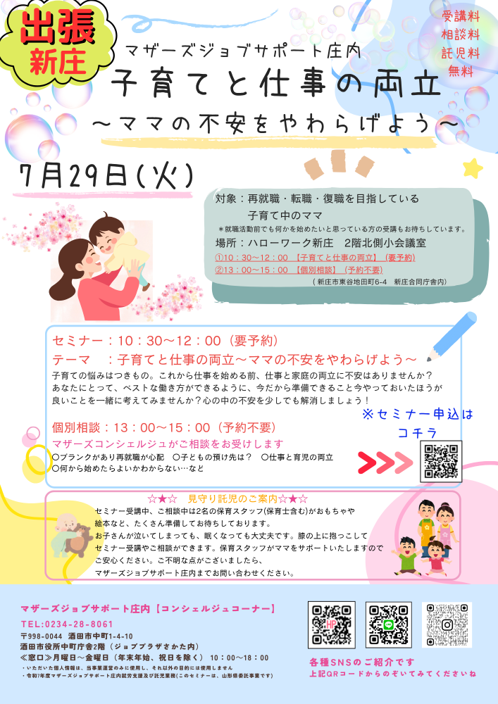 マザーズジョブサポート庄内【子育てと仕事の両立 〜ママの不安をやわらげよう〜】主張相談会を開催します!!【開催日】7月29日(火)【開催場所】ハローワーク新庄 2階北側小会議室 (新庄市東谷地田町6-4 新庄合同庁舎内)@10:30〜12:00 セミナー A13:00〜15:00 個別相談 【内容】@10:30〜12:00(要予約) セミナーテーマ【子育てと仕事の両立 〜ママの不安をやわらげよう〜】子育ての悩みはつきもの。これから仕事を始める前に、仕事と家庭の両立に不安はありませんか?あなたにとってベストな働き方を一緒に考えてみましょう。A13:00〜15:00(予約不要) 個別相談・ブランクがあり再就職が心配・子どもの預け先は?・仕事と家事、子育てとの両立 など、お気軽にご相談ください。※どなたでもご利用いただけます。 ♪お子さんと一緒に、お気軽にお越しください♪お子さんと同じお部屋でセミナーを受講し、相談することができます。保育スタッフが、ママをサポートいたします。 どうぞ、お気軽にお問い合わせくださいね。☆★☆コンシェルジュコーナーでLINEアカウントやっております♪ ☆★☆セミナーのお知らせや、お問い合わせ、お申込みにも対応しています♪ぜひお友達になってください☆https://lin.ee/zBnhdYULINEの場合は「お名前、電話番号、申込み講座、託児の有無」を送信して返信をお待ちください