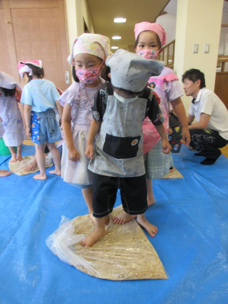 いつも食べている調味料について知るということで、今野醸造店さんに来ていただき、年長組が味噌作りをしました。「おこめみたい」と糀をみたり、大豆を足で踏み潰すとその感触から「へんなかんじする〜」と言いながら慎重に潰していました。踏む、混ぜる、投げるなど力を使う工程に「みそつくるのたいへん!」という感想も聞かれました。10月に完成するため、作った白い味噌が茶色に変わるのを期待して、どんな料理にしようか考えて楽しみにしたいと思います。