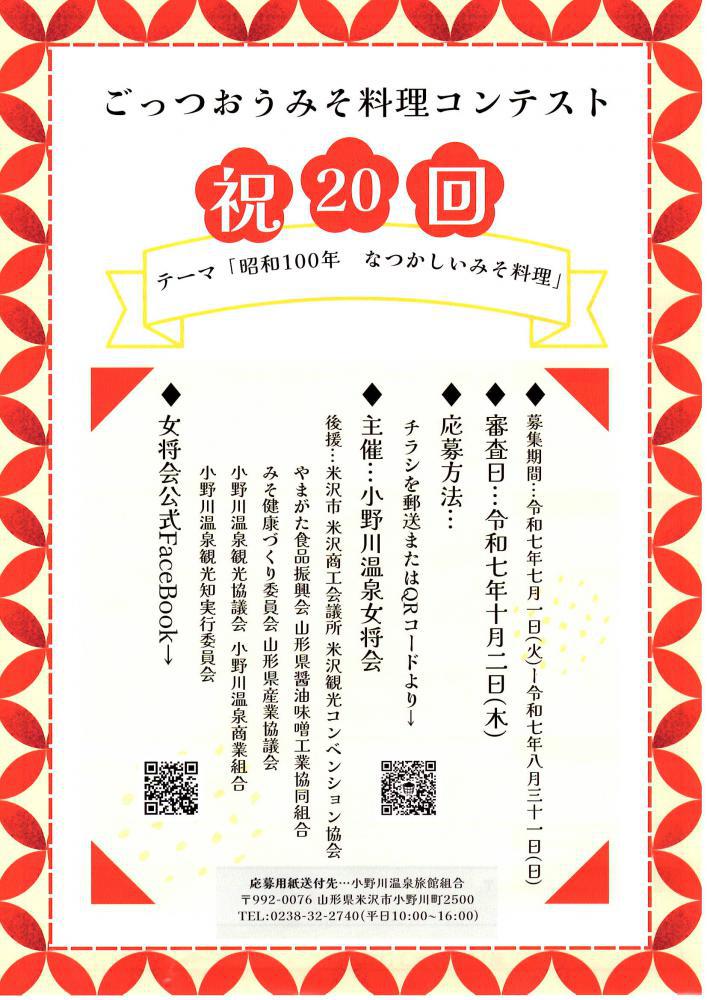 ◇小野川温泉「第20回小野川温泉女将会ごっつおうみそ料理コンテスト」レシピ大募集!今年も小野川温泉女将会では、「ごっつおうみそ料理コンテスト」を開催いたします。テーマは『昭和100年なつかしい味噌料理』です。おひとり様何作品でもご応募いただけますので、アイデアいっぱいのレシピをどしどしご応募ください。また、20周年を記念して、これまでの応募作品の中から最優秀作品を集め、「20周年記念レシピ集」を作成しましたのでこちらからご覧ください。 ◇募集期間 令和7年7月1日(火)〜8月31日(日)◇結果発表 令和7年10月2日(木)※女将会にて試食審査を行います◇賞 品 最優秀賞:小野川温泉宿泊優待券※その他、優秀作品には地元特産品が贈られます。◇応募方法 応募用紙を郵送、またはメールから応募してください。※完成した作品の写真またはイラストを必ず添付またはメールでお送りください。※応募用紙はコチラから※詳細はこちらをご覧ください。【お問合せ・送付先】小野川温泉旅館組合〒992-0076 山形県米沢市小野川町2500TEL:0238-32-2740(平日10:00〜16:00)メール:azumasou3@outlook.jp(作品タイトルを件名に入力ください)