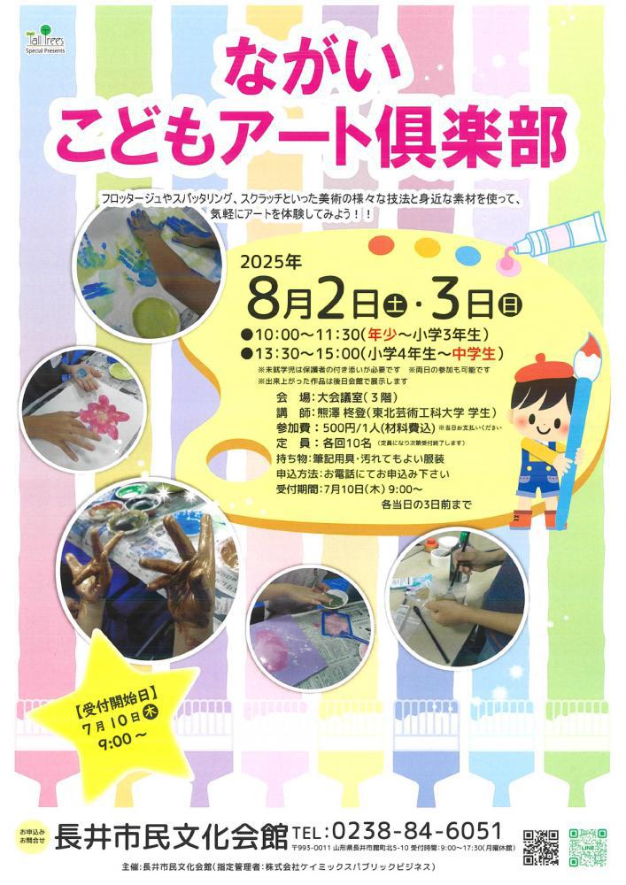 長井市民文化会館にて、「ながいこどもアート倶楽部」が開催されます。フロッタージュやスパッタリング、スクラッチといった美術の様々な技法と身近な素材を使ってアートが体験できます。ぜひ、ご参加ください!<日時>令和7年8月2日(土)、3日(日)●10:00〜11:30(年少〜小学3年)●13:30〜15:00(小学4年〜中学生)<会場>長井市民文化会館 大会議室(3階)<講師>熊澤 柊登(東北芸術工科大学 学生)<料金>500円/1人(材料費込)<定員>各回10名<持ち物>筆記用具、汚れてもよい服装<申し込み先:お問い合わせ先>長井市民文化会館 Tel 0238-84-6051詳細は、チラシをご覧ください。