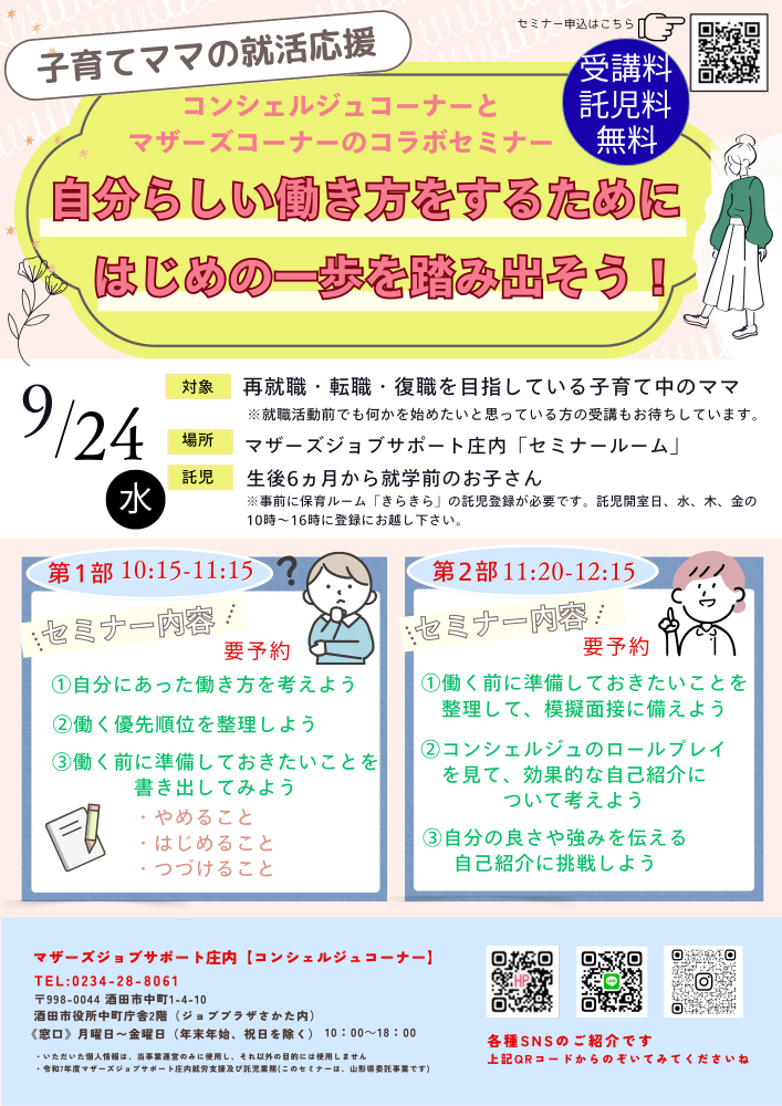 ☆コンシェルジュコーナーとマザーズコーナーのコラボセミナー☆*セミナーテーマ*【自分らしい働き方をするために はじめの一歩を踏み出そう!】● (第1部 10:15〜11:15) 要予約@自分にあった働き方を考えようA働く優先順位を整理しようB働く前に準備しておきたいことを 書き出してみよう● (第2部 11:20〜12:15) 要予約@働く前に準備しておきたことを 整理して、模擬面接に備えようAコンシェルジュのロールプレイ を見て、効果的な自己紹介について 考えようB自分の良さや強みを伝える 自己紹介に挑戦しよう 【日 時】9月24日(水)第1部 10:15~11:15第2部 11:20〜12:15 【対 象】再就職・転職・復職を目指している子育て中のママ※就職活動前で何かを始めたい方でもOK【会 場】マザーズジョブサポート庄内 セミナールーム【料 金】受講料 及び 託児料 無料【託 児】※事前登録・予約が必要です。ご利用希望の方はお問合せください。保育ルーム開室日【水・木・金】の10:00〜16:00に登録が必要となります。 ※併設の保育ルームで、保育スタッフが お子さんをお預かりします。 ママは安心して受講いただけます。 【駐車場について】お車でお越しの際は、中町庁舎脇にある〈セントラルホテル契約駐車場〉をご利用ください。(ジョブプラザさかたと表示してあります。)※契約駐車場が満車の場合は、酒田市中央地下駐車場をご利用ください。無料駐車券(最大2時間)を発行いたします。 どうぞ、お気軽にお問い合わせくださいね。☆★☆コンシェルジュコーナーでLINEアカウントやっております♪ ☆★☆セミナーのお知らせや、お問い合わせ、お申込みにも対応しています♪ぜひお友達になってください☆https://lin.ee/zBnhdYULINEの場合は「お名前、電話番号、申込み講座、託児の有無」を送信して返信をお待ちください ◇お申込み・お問い合わせ◇マザーズジョブサポート庄内TEL:0234-28-8061メールでのお申込みはコチラマザーズジョブサポート庄内コンシェルジュコーナーからの返信をもって申込受付完了となります