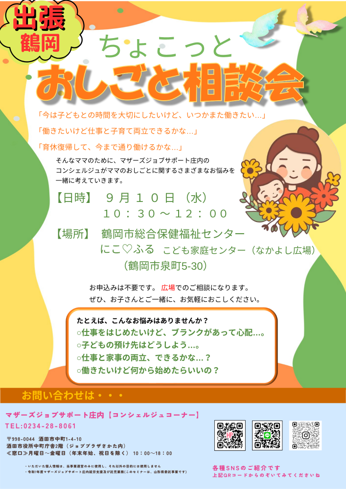 「おしごと相談会」9月開催のお知らせです*.:・.。**.:・.。**.:・.。**.:・.。**9月10日(水)@10:30〜12:00 『ちょこっとお仕事相談会!』そろそろ働こうかな...いつか働こうかな...この働き方で続けていけるかな...そんなママのためにマザーズジョブサポート庄内のマザーズコンシェルジュがママのお仕事に関するさまざまなお悩みを一緒に考えていきます一緒に不安を解消したい方、ご興味のある方、ぜひ、ご参加ください(^^)/お申込みは不要ですぜひ、お子さまと一緒にお気軽に遊びに来てください(^^♪【場所】鶴岡市総合保健福祉センターにこふる こども家庭センターなかよし広場(鶴岡市泉町5-30) どうぞ、お気軽にお問い合わせくださいね。◇お問い合わせ◇マザーズジョブサポート庄内TEL:0234-28-8061☆★☆コンシェルジュコーナーでLINEアカウントやっております♪ ☆★☆セミナーのお知らせや、お問い合わせ、お申込みにも対応しています♪ぜひお友達になってください☆https://lin.ee/zBnhdYULINEの場合は「お名前、電話番号、申込み講座、託児の有無」を送信して返信をお待ちください