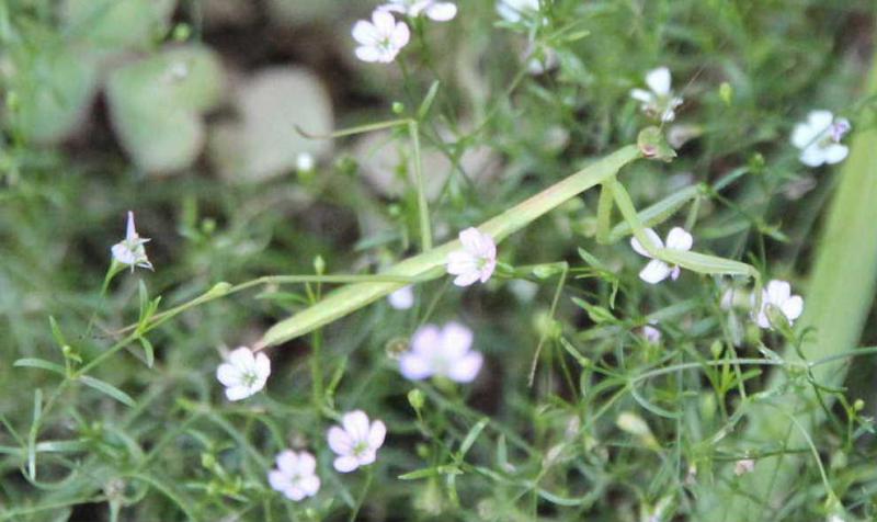 ●雨が降り刺さるような暑さがなくなり心持ち涼しくなりました 庭のカスミソウに数センチの小さな「カマキリ」を見つけました 「カマキリ」は6月頃にふ化すると言われていますが ふ化してまもないような淡い黄緑の小さな「カマキリ」で涼しっくなって生まれたのでしょうか 草花も生き物も少し息をふき帰したのでしょうか