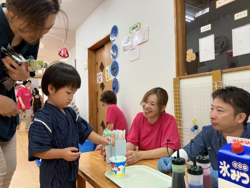 8月2日(土)子どもたちが待ちに待っていた夏まつりが行われました。前日に出店の紹介があり、その時から子どもたちのワクワク感が高まっていました。特に「とっつけ」では、光る玩具やカシューシャがあり見ると「わー」と歓声を上げ目をキラキラさせていました。そして当日は役員のお父さん方に手伝いのご協力をいただきながら夏まつりがスタート!子どもたちは甚平や色とりどりの浴衣姿で夏まつりの雰囲気を一段と盛り上げてくれました。おにぎり、からあげ、ジュース、かき氷にお化け屋敷、水ヨーヨーつり、金魚すくい、的当て、とっつけ、駄菓子の千本引きなどを家族で楽しみ、最後は花火を見て夏の楽しいひとときを過ごしました。