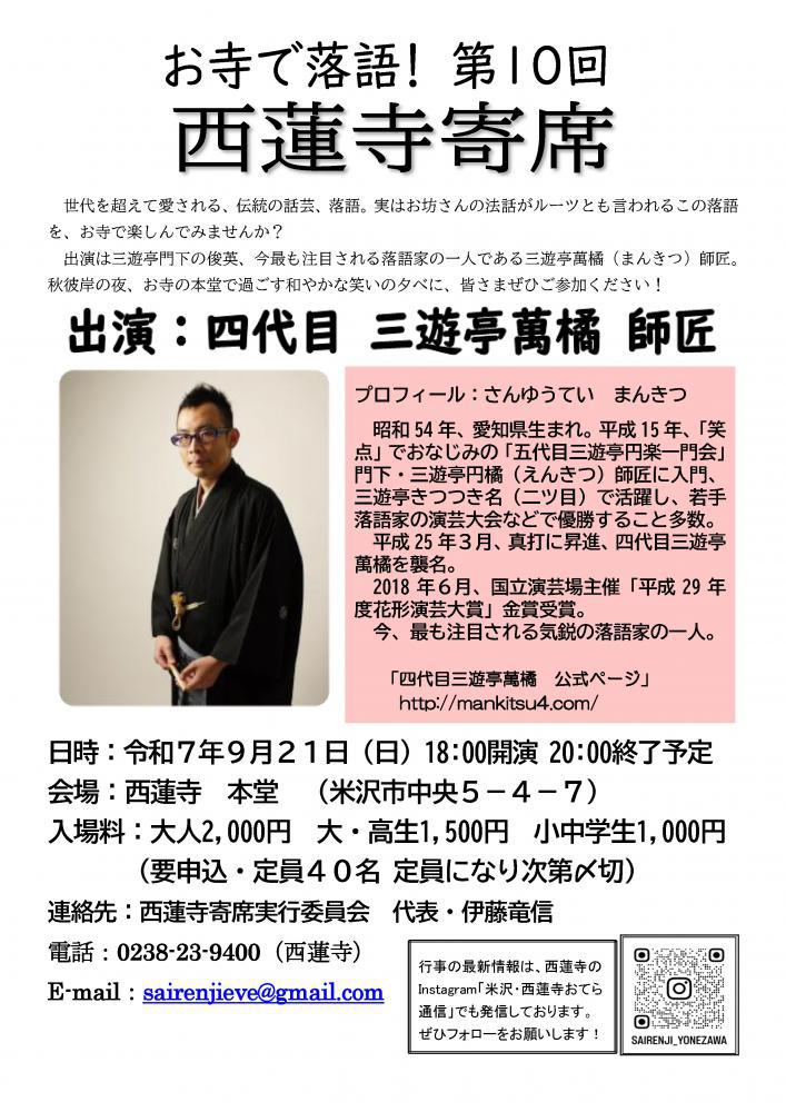 世代を超えて愛される、伝統の話芸、落語。実はお坊さんの法話がルーツとも言われる落語を、夜のお寺で楽しんでみませんか?出演は三遊亭門下のエース、気鋭の落語家・三遊亭萬橘(まんきつ)師匠です!秋彼岸の夜、お寺の本堂で過ごす和やかな笑いの夕べに、皆さまぜひご参加ください!日 時:令和7年9月21日(日)18:00開演 20:00終了予定会 場:西蓮寺 本堂 (米沢市中央5−4−7)入場料:大人2,000円 大高生1,500円 小中学生1,000円    (要申込・定員40名 定員になり次第〆切)連絡先:西蓮寺寄席実行委員会 代表・伊藤竜信電 話:0238-23-9400(西蓮寺)E-mail: sairenjieve@gmail.com出 演:四代目 三遊亭萬橘昭和54年、愛知県生まれ。平成15年、「笑点」でおなじみの「五代目三遊亭円楽一門会」門下・三遊亭円橘(えんきつ)師匠に入門、三遊亭きつつき名(二ツ目)で活躍し、若手落語家の演芸大会などで優勝すること多数。平成25年3月、真打に昇進、四代目三遊亭萬橘を襲名。2018年6月、国立演芸場主催「平成29年度花形演芸大賞」金賞受賞。今、最も注目される気鋭の落語家の一人。