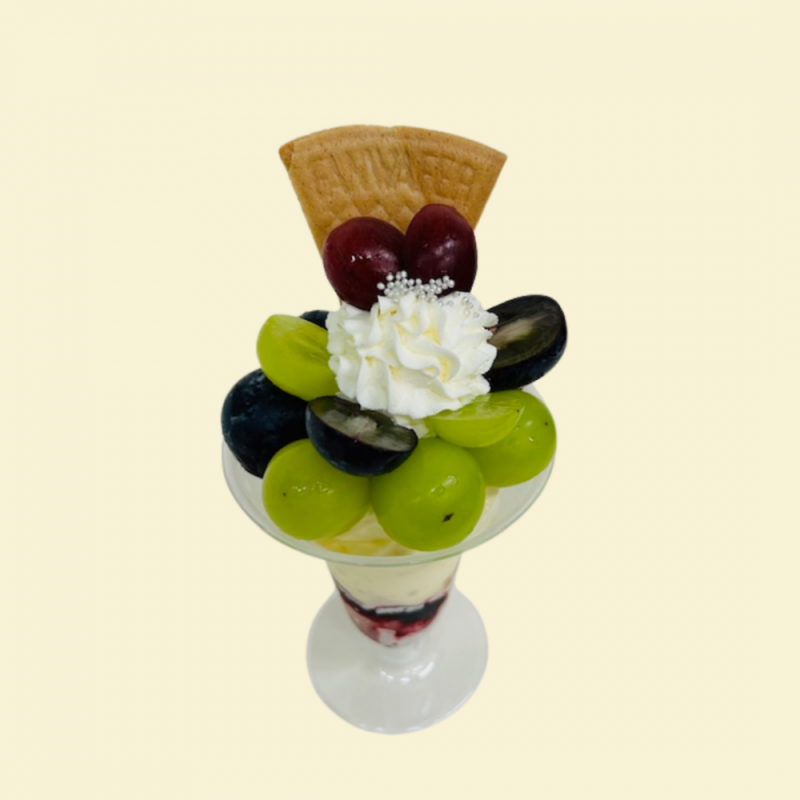 ●ぶどう食べ比べパフェ1,512円山形産シャインマスカット長野産ナガノパープル山梨産我が道ぶどう三大産地の食べ比べ!