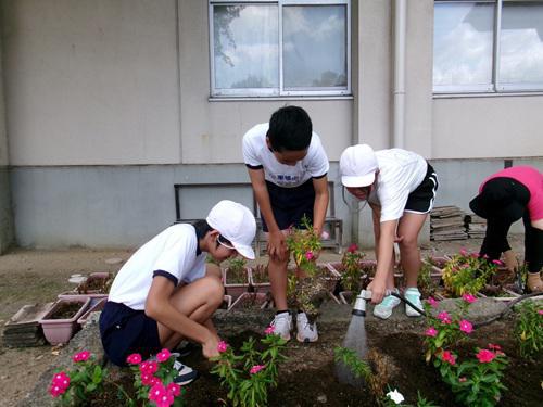 9月18日(木)、全学年で行った運動会練習後のことです。 秋の植え替えのためプランターをきれいにする前に、まだ一生懸命咲いているプランターの花を花壇に植え替えてあげようと思い、一人で移植ベラを持って格闘していたところ、6年生の児童が私の姿に気付いてくれました。「校長先生、手伝いますよ。」という声。「今まで、外で一生懸命練習していたんだから、大丈夫。休んでね。」と言うと、「これくらい、平気です。」「私もやるー。」「何やってるんですか、ぼくもやろうかな。」と数名の6年生が集まってきてくれました。 花壇からラウンドに目をやると、各組の応援団をまとめている6年応援団幹部の姿や、運動会練習で疲れ切った1年生の手を引き、面倒を見ている6年生の姿も・・・。 誰かのために自然に行動できる6年生の姿を目の当たりにし、とても幸せな気持ちになりました。1人・・・。2人・・・。どんどん増えていきました。お手伝いしてくれた6年生の皆さんの姿、下学年の子供たちのお手本です。植え替えてもらった花も喜んでいるようです。