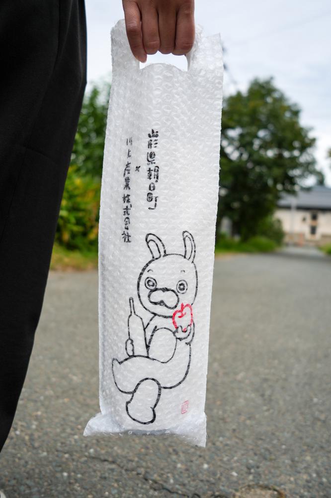 両面に桃色ウサヒのイラストが入った、ワインボトルや日本酒の四合瓶、リンゴジュースなどが入るサイズです