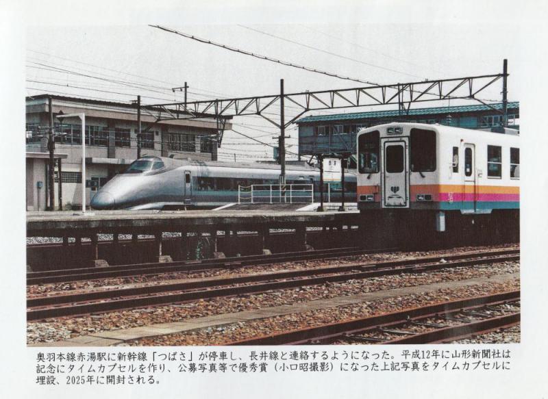 10月13日の地元紙に「タイムカプセル開封」の記事が掲載された。20世紀の最後の年に「今、21世紀に伝えたいもの」と題して、県民から募集した宝物を納めていたものを、25年経った今年、開封したものである。テレビでは開封するシーンが放映されたが、その中に映っていたのが、上の写真であった。長井市役所職員として山形鉄道鰍フ設立に携わり、退職してからは羽前成田駅協力会の事務局として永く交通問題に携わられた故小口昭さんの作品である。小口昭さんの作品はこちらからご覧ください。 → 小口昭遺作展スタート(お盆の休館お知らせ):おらだの会 → 羽前成田駅100年物語:おらだの会 「25年前の君へ」 あれから25年たった。君の後継にE8君が登場したけれど、トラブル続きで可哀そうだった。君は今でも、「銀つば」と呼ばれてみんなから愛されているよ。君はカッコ良くて、何より大きな窓のある君との旅はとても楽しいものだった。今から25年後は、長大トンネルが完成しているかもしれないね。 僕らのフラワー号は、新幹線と並んで胸を張っているように見えた。君は私たちのヒーローだった。25年たった今年は、社員が少なくなったり、詐取事件に巻き込まれたりと、とても大変な時を迎えているんだ。でもクラウドファンディングに地元はもちろん、全国からも応援が寄せられている。車両のコスチュームは変わるかもしれないけれど、鉄路を守った人達の思いはこれからもずっとずっと繋げて行くからね。