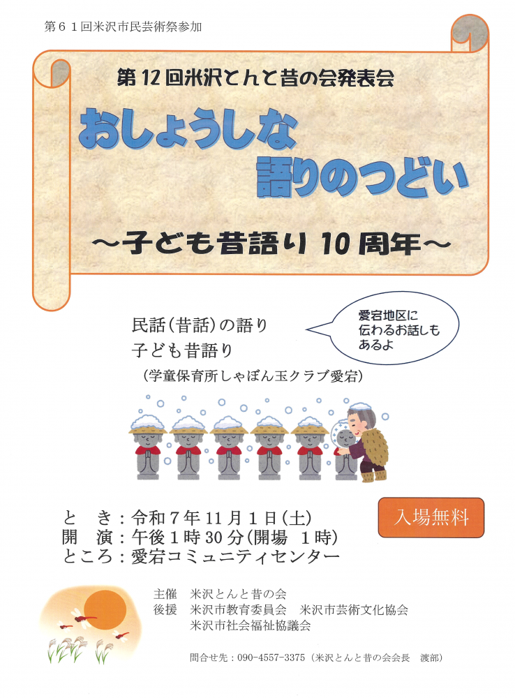 米沢市愛宕コニュニティーセンターにて、米沢とんと昔の会による民話(昔話)の語り、学童保育所しゃぼん玉クラブ愛宕による子ども昔語りが披露されます。ぜひ、ご来場ください。<開催日時>令和7年11月1日(土) 開演:13:30(開場:13:00)<場所>米沢市愛宕コミュニティセンター(米沢市古志田町76−3)<入場料>無料<問い合わせ>TEL:090-4557-3375(米沢とんと昔の会会長 渡部)詳細はコチラ