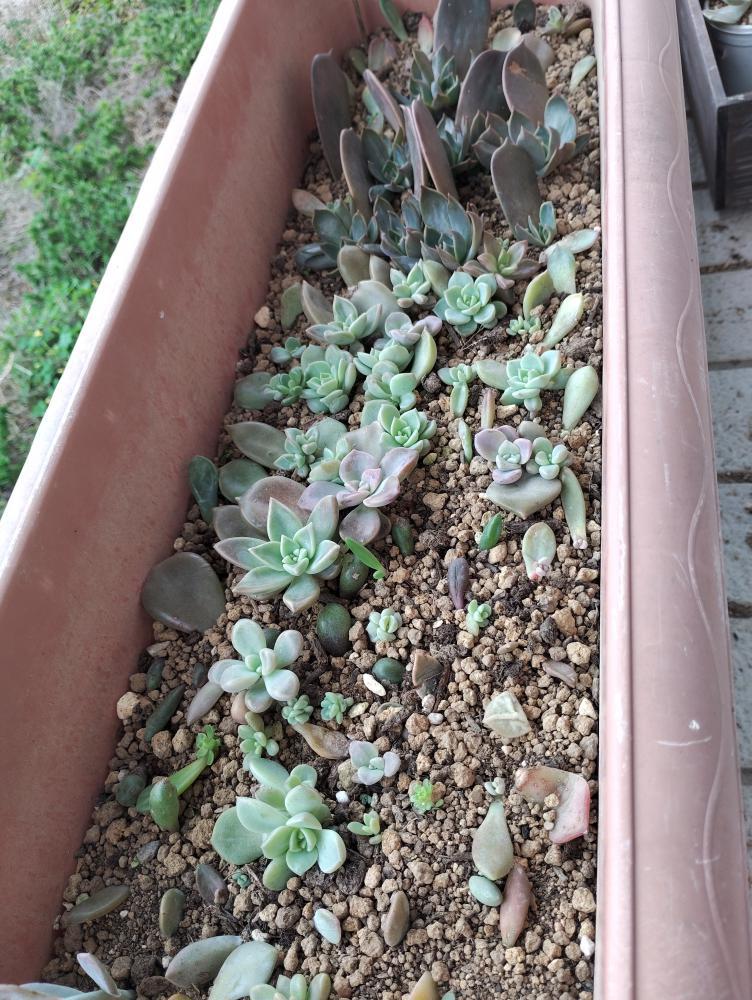 プランターですくすく育った葉挿しの多肉ちゃん達で寄せ植えが完成しました(〃'▽'〃)【ガーデン多肉ゆう】さんのご指導のもと、プランターから葉挿しの子苗を慎重に抜いて、色味や大きさのバランスを考えながら新しい鉢に配置して、次々と植え込んでいき、自宅で増やしているセダムで隙間を埋めて、可愛い寄せ植えができました\(^o^)/セダムの根がついて、立ち上がってきたらもっと素敵になるはず☆驚くことに、まだまだ大きく元気な親葉は再び土に挿しておくと、新たに子ができるのこと!いつまでも楽しめますね( ´艸`)