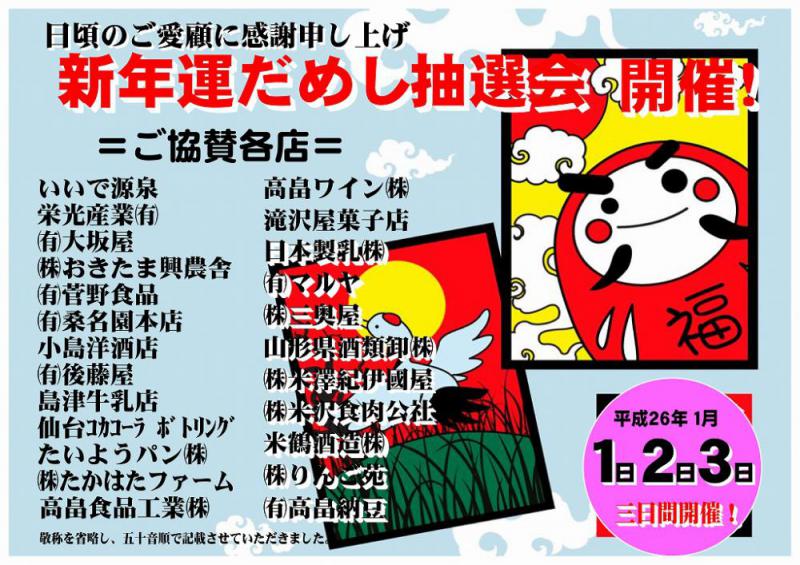 2014年1月1日〜3日 高畠町太陽館にて高畠町太陽館温泉にご入浴の方を対象に【新年運試し抽選会】 が開催されます! 今年も高畠町内外からたくさんのご協賛をいただき、さまざまな景品をご用意してお待ちしております!!お正月はご家族みんなで太陽館にお越しください♪ お問合せ:高畠町太陽館 0238-57-4177