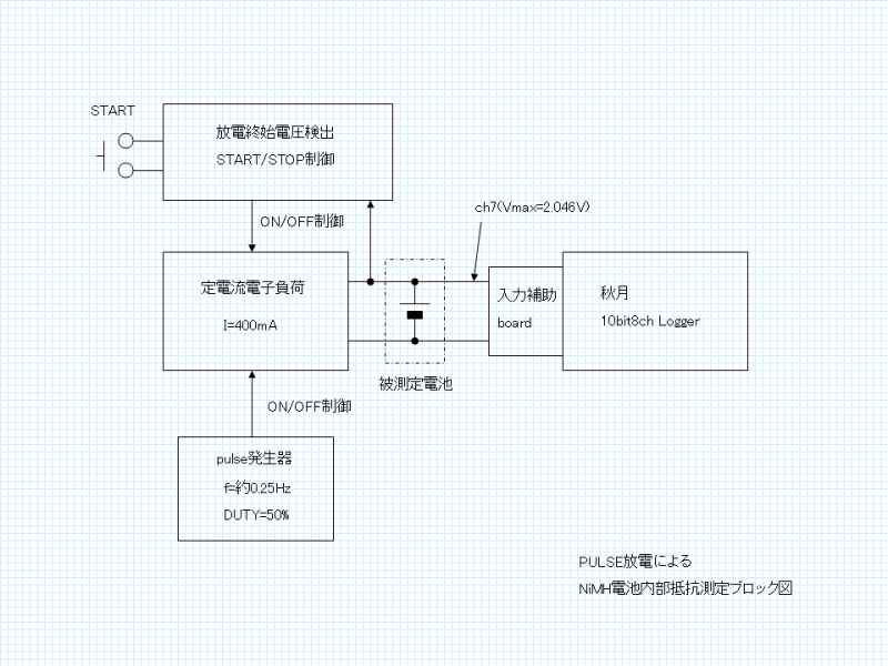 そこで放電電流のON/OFF時の電圧変化の測定により簡易的に内部抵抗を測定する「pulse放電方式」を検討、実際に機材の製作し、測定を行う事にした。