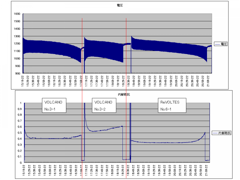 ・ReVOLTESに比べ、充電がはじかれる程劣化しているVOLCANOは内部抵抗が大きい。