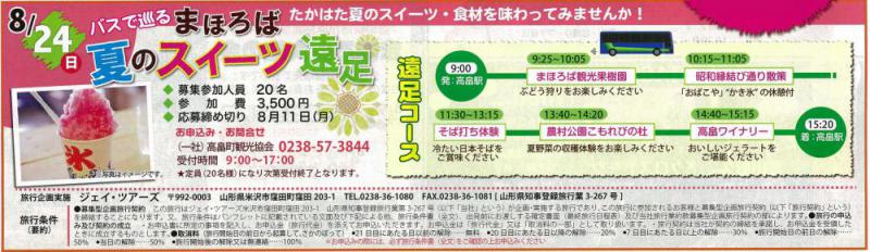 山形DC特別企画 バスで巡る“まほろば夏のスイーツ遠足”を実施します。期 日 平成26年8月24日(日)募集人員 20名参加費 3,500円かき氷やジェラードを食べながら、ぶどう狩り、そば打ち、夏野菜収穫等の体験をし、高畠町内をバスで巡る楽しい企画です。みなさん、是非ご参加ください。