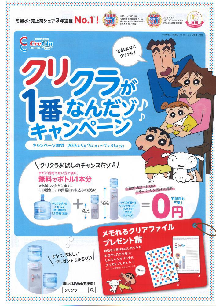 クリクラのお試しキャンペーンが始まりました♪その名も、「クリクラが一番なんだゾ♪」 キャンペーン ( ´ ▽ ` )ノ  期間は・・・2015年5月7日(木) 〜2015年7月31日(金)   期間中に無料お試しセットをお届けした方にもれなくしんちゃんのクリアファイル も プレゼント!!  以前から、しんちゃんのCMのお水が気になっていた!宅配水ってどういうお水??とお考えだった方は、お得にお試しができる今がチャンスです☆◎お試しだけでもOK! どうぞお見逃しなく!(^0^)/