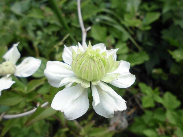 美蔵の庭では今、クレマチスの「白万理」が咲いております(^。^)v白い八重の花で綺麗です(^^♪8年目の花ですが・・・・・年々?小さくなっているような気がします。管理が悪いのかな???花が終わったら、肥料やらなくては・・・・(−。−):