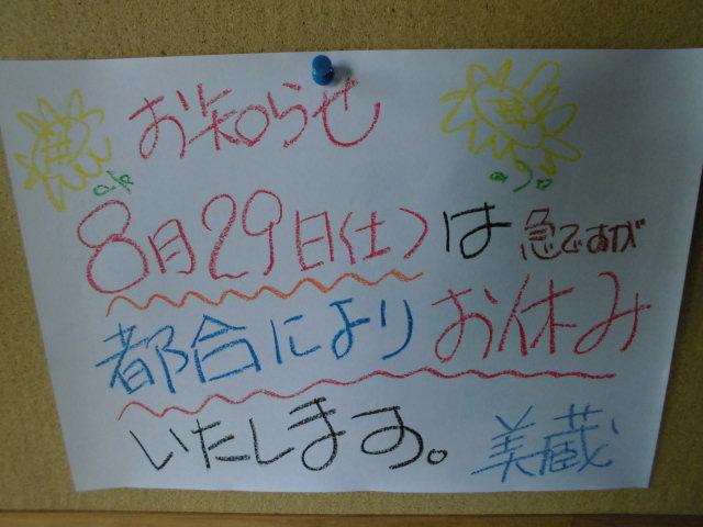 夏休みさせて頂いたばかりですが・・・あす(8/29)土曜日は、急に用事が入りましたのでお休みさせて頂きます。誠に、申し訳けございません。