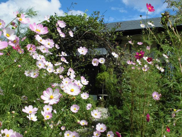 今日の雨上がりの美蔵の庭は・・・・・(−。−);またもや・・・・・・今週が見ごろの「コスモス」がバサバサ倒れて大変なことになっております。アーチのところは、背の高いコスモスがわさわとお客様をお出迎えしております(^。^)v花粉にお気を店内にお越しくださいませ・・・・・(^^♪
