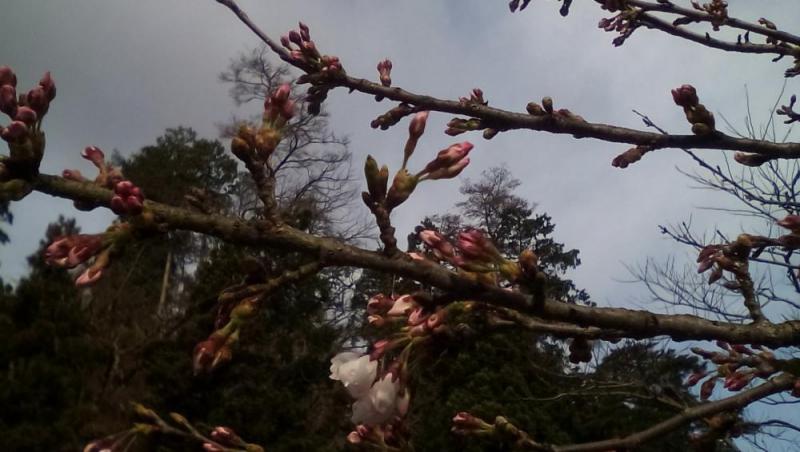 今日は、朝から寒いです(_ _)高い山は、雪が降り白くなっております。美蔵の「さくら」が2輪ほど、咲きました(●^o^●)開花宣言いたします。寒さで、少しさくらの花がかわいそうです。どれどれ?お花見だんごたべなくちゃ~(^_-)-☆ 美蔵の近くの、犬の宮・猫の宮の桜はまだ、咲いておりません。