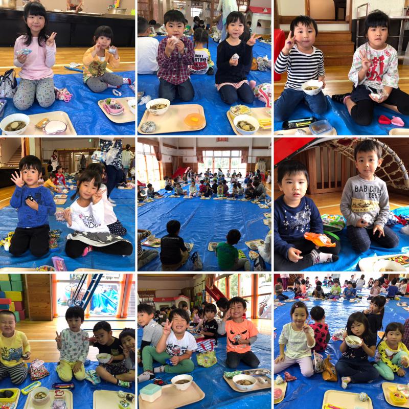 芋煮会はお遊戯室で、こねこ組〜らいおん組の縦割りで芋煮を食べました。