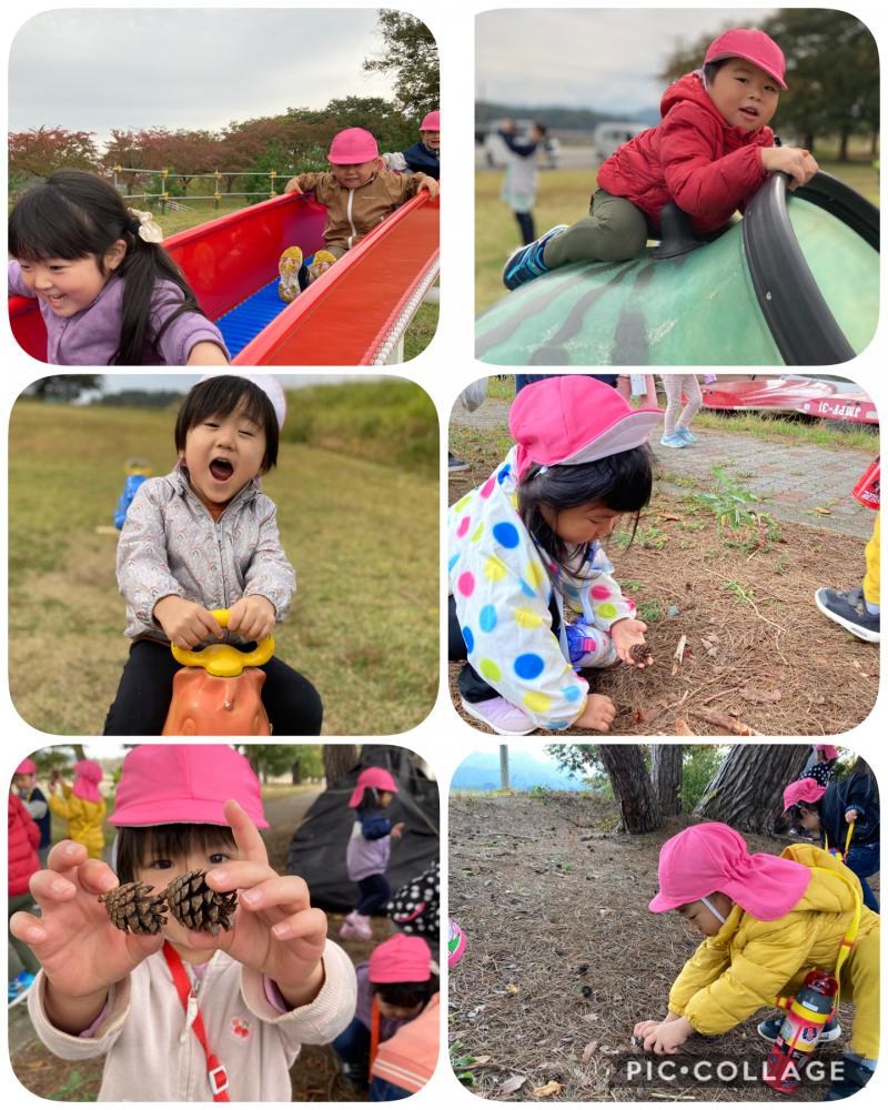 園バスに乗って徳良湖に行ってきました。松ぼっくりを拾ったり、きのこを見つけたりと沢山の秋を発見してきましたよ!公園では、滑り台や色んな遊具でお友達と一緒に元気いっぱい遊んでいた年少組さんでした。