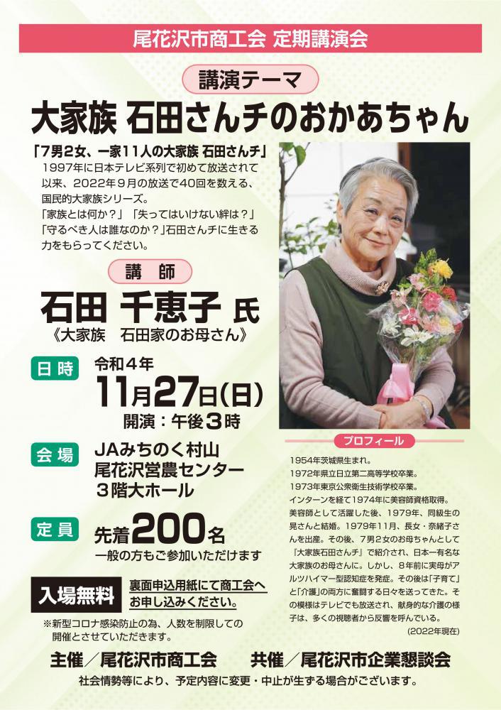 講 師:石田千恵子氏(大家族石田家のお母さん)