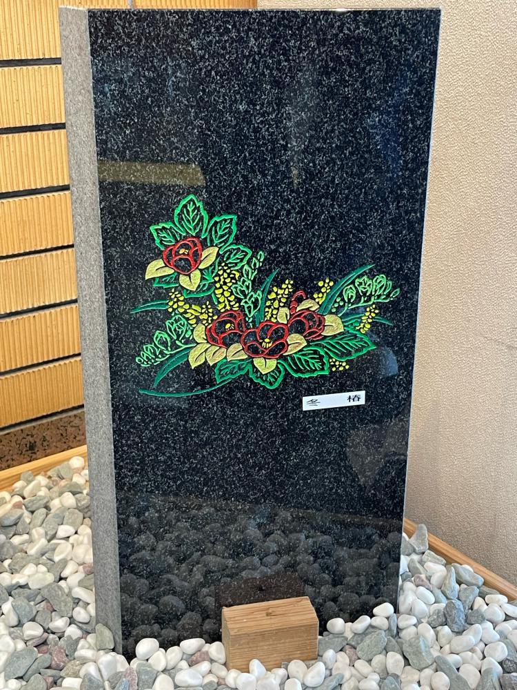 本日、石の浄朝(有)親子三人展9日目 最終日になりました。御覧になって頂いた皆様本当にありがとうございました。午後から作品を撤収させていただき、引き続き、弊社会長が代表を務めさせていただいております、墓地景観創造研究会の会員の皆様による『我が社の逸品』パネル展示&好きな石屋さんに投票という展示を本日から3月17日まで村山総合支庁ロビーにて開催しております。 皆様、お近くにお寄りの際は是非ご覧になってください。 『やすらぎ石室』~四季の花園冬のとき 椿