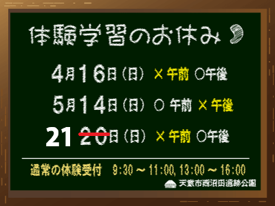 要予約の体験講座やその他の事業開催に伴い、体験学習(いつもの体験・季節体験)を休止します。ご不便をおかけしますが、ご了承ください。(追記)一部日付に誤りがありました。訂正してお詫びいたします。