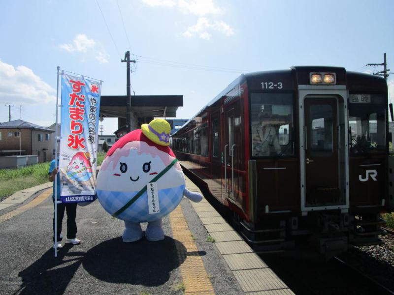 9月17日(日)にJR左沢線で「おいしい山形秋まつり号」が運転され、 羽前山辺駅で「すだまりんちゃん」が下り列車をお見送りしました。