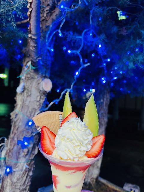 12月に入ると、お店のBGM(有線)がクリスマスソング一色にかわりました。クリスマスリースを飾って、《Xmasパフェ》がスタートです♪いつ食べてもおいしい!マスクメロンに大粒のあまおう苺この時期だけのSpecialなフルーツのコラボをお楽しみください。 フルッティアの植え込みをいつも素敵に彩ってくれる大井沢の「ミスとガーデン」さん冬の植え替えにあわせてイルミネーションも飾ってくれました。いつもありがとうございます。
